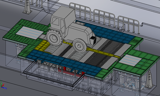 采用三段插接式移動(dòng)蓋板,滿足2140~4000m軸距調(diào)節(jié)要求,以及蓋板承重25t要求。四塊固定插接分別安裝在兩個(gè)后轉(zhuǎn)鼓框架和蓋板固定上,四塊移動(dòng)插接板分別安裝在兩個(gè)可移動(dòng)前轉(zhuǎn)鼓框架兩側(cè),中間活動(dòng)插接板由支撐架支撐,支撐架采用隨動(dòng)設(shè)計(jì),與軸距調(diào)節(jié)裝置一起移動(dòng)。支撐架底部安裝重載滾輪,減小移動(dòng)阻力。